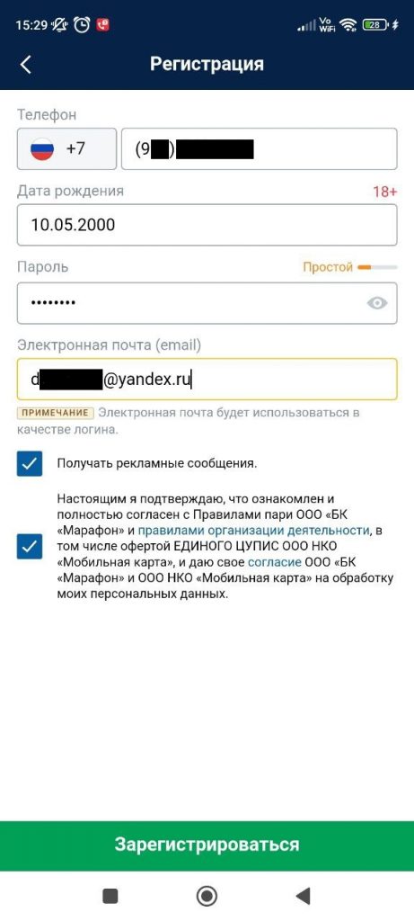 - Создайте учетную запись в Марафон, указав необходимые сведения.