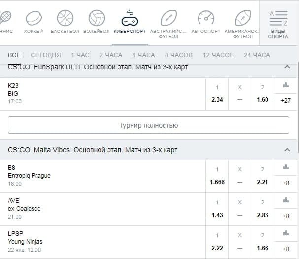 Линия на киберспорт в БК «Марафон» не самая широкая, если сравнивать с лучшими букмекерскими конторами в этой области, однако глубина росписи на каждое событие не уступает конкурентам. В «Марафоне» можно поставить на топовые матчи CS:GO (27 маркетов), Dota 2 (22 маркета), Rainbow Six Siege (17 маркетов), League of Legends (18 маркетов) и FIFA (25 маркетов в линии, 125 маркетов в Live), также принимаются live-ставки на NHL (99 маркетов).