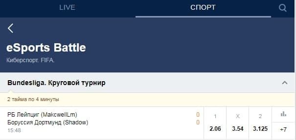 Скриншот линии в мобильной версии БК «Марафон» на матчи FIFA eSports Battle