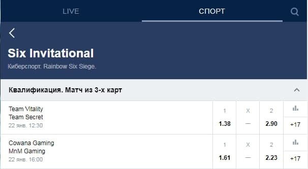 Скриншот линии БК «Марафон» на матчи Rainbow Six Siege